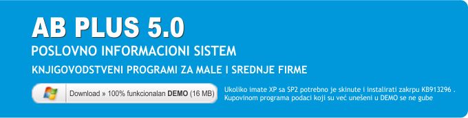 Distributeri Slobodni smo vam ponuditi knjigovodstveni paket 'AB PLUS' za daljnju prodaju na cijelom prostoru Ex. Jugoslavije. Prodaju programa možete ostvariti kao distributeri ili zastupnici. Više...