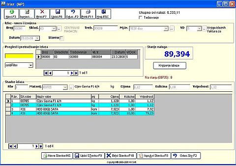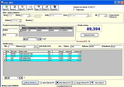 Kod unosa podataka za stavke nalga prvo se klikne mišem na "Nova stavka" ili tipkaINSERT, kursor se pozicionira na "Šifra materijala" koju treba obavezno unijeti do 8 karaktera, a zatim "Cijena", "Kolicina" , "Vrijednost" program racuna. Kod unosa podataka na stavkama naloga obavezni su za unos "Šifra materijala", "Cijena" , "Kolicina". Posto se unesu svi podaci automatski se zapamtite podaci klikom miša"UpisiStavke" ili tipkama ENTER na stavku "Vrijednost". Ispravka se vrsi pozicioniranjem na zeljeni slog i klikom miša na "IspraviStavke" ili tipkama ALT+I (F8). Izlazak iz forme se vrsi klikom misa na "Kraj" , tipkama ALT+K ili tipkom ESC. Brisanje podataka (ozneceni slog) se vrši klikom miša na dugme "Briši" ili tipkama ALT+B(F10). U slucaju da neku operaciju smo zapoceli "Upis", "Ispravi" i sl i želimo da odustanemo tad klikonemo mišem na dugme "Odustani" ili tipkama ALT+O.