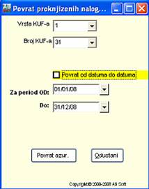 Komandno dugme "Povrat Azur.KUF" je namjenjeno da se željeni nalog povrati u neazurirane naloge. Klikom na dugme " Povrat Azur.KUF " pojavi se meni za povrat azuriranog naloga na kojem je odabran selektovani nalog sa forme „Proknjizeni nalozi" ili sami odaberemo drugi nalog izborom sa padajuceg menija "Vrsta KUF-a" i „Broj KUF-a” a zatim kliknemo na dugme, a " Povrat Azur.KUF " ili tipkama ALT+K.