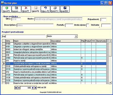 Kod unosa podataka prvo se klikne mišem na "Novi" ili tipkama ALT+N (F3), kursor se pozicionira na šifru konta koju treba obavezno unijeti do 8 karaktera, a zatim "Naziv"konta i tako redom ostali podaci za konto. Kod unosa podataka o kontu obavezni su za unosŠifra, Naziv konta. Posto se unesu svi podaci trebaju se zapamtiti podaci klikom miša"Upisi" ili tipkama ALT+U (F6) . Ispravka se vrsi pozicioniranjem na zeljeni slog i klikom miša na "Ispravi" ili tipkama ALT+R (F4) . Izlazak iz forme se vrsi klikom misa na "Kraj" , tipkama ALT+K ili tipkom ESC. Brisanje podataka (ozneceni slog) se vrši klikom miša na dugme "Briši" ili tipkama ALT+B (F7) . U slucaju da neku operaciju smo zapoceli "Upis", "Ispravi" i sl i želimo da odustanemo tad klikonemo mišem na dugme "Odustani" ili tipkama ALT+O.
