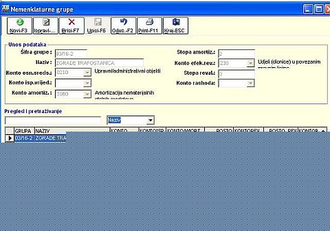 Kod unosa podataka prvo se klikne mišem na "Novi" ili tipkama ALT+N, kursor se pozicionira na šifru grupe koju treba obavezno unijeti do 6 karaktera, a zatim "Naziv"grupe, a zatim sa padajuce liste "Konto osnovnog sredstva" , "Konto amortizacije ", "Konto amortizacije " , pa se upise "Stopa amortizacije", sa padajuce liste "Konto efektivne revalorizacije", upise "Stopa revalorizacije", sa padajuce liste "Konto rashoda " . Kod unosa podataka o šiframa grupa obavezni su za unos Šifra, Naziv , Konto osnovnog sredstva, "Konto amortizacije ", "Konto amortizacije " "Stopa amortizacije"amortizacione grpe osnovnog sredstva. Posto se unesu svi podaci trebaju se zapamtiti podaci klikom miša "Upisi" ili tipkama ALT+N. Ispravka se vrsi pozicioniranjem na zeljeni slog i klikom miša na "Ispravi" ili tipkama ALT+R. Izlazak iz forme se vrsi klikom misa na"Kraj" , tipkama ALT+K ili tipkom ESC. Brisanje podataka (ozneceni slog) se vrši klikom miša na dugme "Briši" ili tipkama ALT+B. U slucaju da neku operaciju smo zapoceli"Upis", "Ispravi" i sl i želimo da odustanemo tad klikonemo mišem na dugme "Odustani"ili tipkama ALT+O.