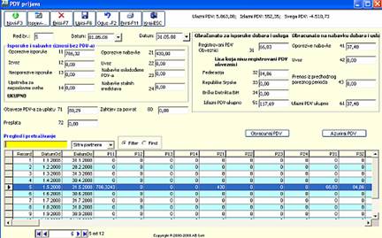 Obračun PDV se vrši nakon što se za mjesec za koji se obračunava proknjiži KUF i KIF i to tako da se u modulu PDV (KUF/KIF) od Izvjestaji (KUF/KIF) klikne „PDV prijava“ otvori se maska za obrčun PDV slika 8.0 i označi se mjesec za obračun i klikne na dugme „Obračun PDV“ i nakon toga javi poruku da je izvršen obračun. Ponovnim otvaranjem gore navedene forme i označavanjem mjeseca za koji želimo da otprintamo PDV prijavu pritisnemo dugme„Štampa“ ili F11 i nakon toga će se na ekranu pojaviti PDV prijava.