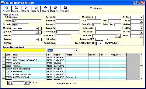 Kod unosa podataka prvo se klikne mišem na "Novi" ili ALT+N (F3) , tada se automatski generira šifra partnera i kurosor se pozicionira na "Naziv" unosi se naziv partnera i tako redom ostali podaci za firmu. Kod unosa podataka o firmi obavezni su za unos Naziv, Mjesto i Maticni broj partnera. Posto se unesu svi podaci trebaju se zapamtiti podaci klikom miša "Upis" ili tipkama ALT+U (F6) . Ispravka se vrsi pozicioniranjem na zeljeni slog i klikom miša na "Ispravi" ili tipkama ALT+R (F4) . Izlazak iz forme se vrsi klikom misa na "Kraj" , tipkama ALT+K ili tipkom ESC. Brisanje podataka (ozneceni slog) se vrši klikom miša na dugme "Briši" ili tipkama ALT+B (F7) . U slucaju da neku operaciju smo zapoceli "Upis", "Ispravi" i sl i želimo da odustanemo tad klikonemo mišem na dugme"Odustani" ili tipkama ALT+O.