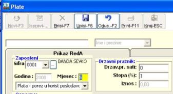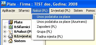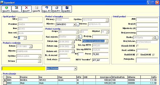 Kod unosa podataka prvo se klikne mišem na "Novi" ili A LT+N (F3), tada se automatski generira šifra zaposnog i kurosor se pozicionira na "Prezime" unosi se prezime zaposlenog i tako redom ostali podaci za zaposlenog. Kod unosa podataka o zaposlenog obavezni su za unos Prezime, ime, opština stanovnja, iznos ugovora i banka na koju prima plaću. Posto se unesu svi podaci trebaju se zapamtiti podaci klikom miša "Upis" ili tipkama ALT+U (F6). Ispravka se vrsi pozicioniranjem na zeljeni slog i klikom miša na "Ispravi" ili tipkamaALT+R (F4). Izlazak iz forme se vrsi klikom misa na "Kraj" , tipkama ALT+K ili tipkom ESC. Brisanje podataka (ozneceni slog) se vrši klikom miša na dugme "Briši" ili tipkama ALT+N (F7). U slucaju da neku operaciju smo zapoceli "Upis", "Ispravi" i sl i ako želimo da odustanemo tad klikonemo mišem na dugme "Odustani" ili tipkama ALT+O (F2).