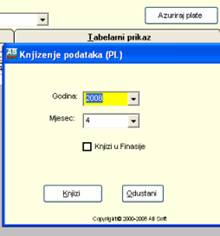 Pošto smo unijeli zaposlene i iznos plaća po Ugovoru idemo na padajući meni o otvorimo„Unos podataka za plaće“ i tada kliknemo „Novi“ ili „F3“ (Slika 6.1.) pojavi se šifra zaposlenog odaberemo šifru i pritisnemo „ENTER“, i kursor se prebaci na mjesec unesemo željeni mjesec u ovom slučaju 4 (Slika 6.2.) i nakon toga pritisnemo dugme „Upisi“ ili F6 i tada je zaposlenim unesen za željeni mjesec za obračun u ovom slučaju 4. Idući obračun za 5 mjesec se automatski obračunava kopiranjem 4 mjeseca.