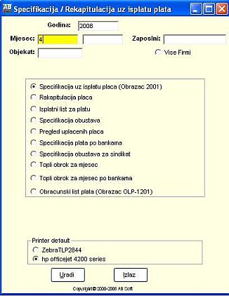 Printanje izvještaja npr. Specifikacija uz isplatu plaća, idemo na “Izvještaje (PL) I kliknemo “Izvještaji – plate” I dobijemo formu (Slika 6.5.) gdje je upisana željena godina2008 I mjesec 4 za koji tražimo izvješta u ovom slučaju je označen: Specifikacija uz isplatu plaća klikom na dugme na ekranu čemo dobiti navedeni izvjestaj koji možemo otprintati ako želimo.
