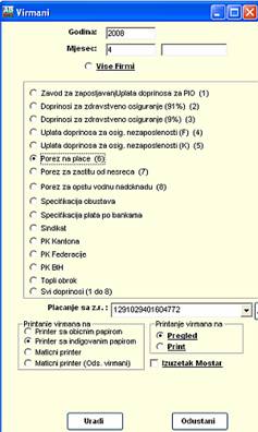 Printanje Virmana npr. Porez na plaće, idemo na “Izvještaje (PL)” I kliknemo “Virmani” I dobijemo formu (Slika 6.6.) gdje je upisana željena godina 2008 I mjesec 4 za koji tražimo Virman u ovom slučaju je označen: Porez na plaće klikom na dugme na ekranu ćemo dobiti navedeni Virman koji možemo otprintati ako želimo.