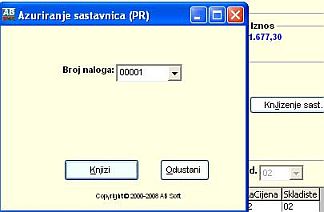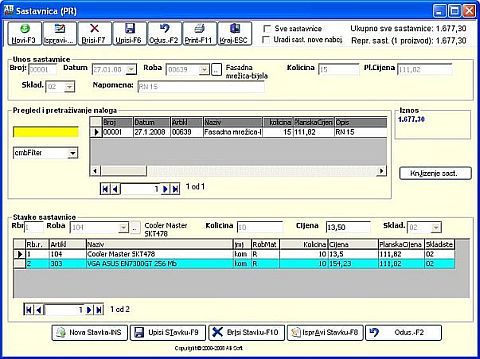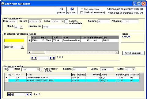 Kod unosa podataka za stavke sastavnice prvo se klikne mišem na "Nova stavka" ili tipkaINSERT, kursor se pozicionira na "šifru robe" koju treba obavezno unijeti do 8 karaktera, a zatim "količinu" i tako redom. Posto se unesu svi podaci automatski se zapamtite podaci klikom miša "UpisiStavke" ili tipkama ENTER na stavku "Skladište". Ispravka se vrsi pozicioniranjem na zeljeni slog i klikom miša na "Ispravi Stavke" ili tipkama ALT+T (F8). Izlazak iz forme se vrsi klikom misa na "Kraj" , tipkama ALT+K ili tipkom ESC. Brisanje podataka (ozneceni slog) se vrši klikom miša na dugme "Briši" ili tipkama ALT+N (F7). U slučaju da neku operaciju smo započeli "Upis", "Ispravi" i sl i želimo da odustanemo tad klikonemo mišem na dugme "Odustani" ili tipkama ALT+O.