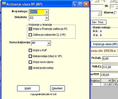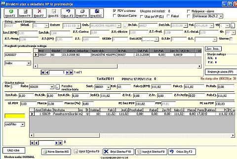 Kod unosa podataka za stavke nalga prvo se klikne mišem na "Nova stavka" ili tipkaINSERT, kursor se pozicionira na "Šifra robe" koju treba obavezno unijeti do 8 karaktera, a zatim “Sastavnica” , "Fakturna cijena", "Procenat rabata" , "Iznos rabata" program racuna, "Jedinicna cijena" , "Zavisni troškovi", program racuna, "Nabavna cijena", "Marza ", "Porez" , "Veleprodajna cijena", "Vrsta dokumenta", "Marza " i " Sifra skladista". Kod unosa podataka na stavkama naloga obavezni su za unos "Šifra robe", "Cijena" , Kolicina", "Broj dokumenta" i "Konto". Posto se unesu svi podaci automatski se zapamtite podaci klikom miša "UpisiStavke" ili ALT+A(F9) ili tipkama ENTER na stavku "Opis". Ispravka se vrsi pozicioniranjem na zeljeni slog i klikom miša na "IspraviStavke" ili tipkama ALT+T (F8).Izlazak iz forme se vrsi klikom misa na "Kraj" , tipkama ALT+K ili tipkom ESC. Brisanje podataka (ozneceni slog) se vrši klikom miša na dugme "Briši" ili tipkama ALT+I(F10) U slucaju da neku operaciju smo zapoceli "Upis", "Ispravi" i sl i želimo da odustanemo tad klikonemo mišem na dugme "Odustani" ili tipkama ALT+O.