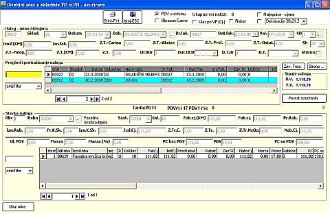 Kod unosa podataka za nalog prvo se klikne mišem na "Novi" ili tipkama ALT+N (F3), kursor se pozicionira nadatum koju treba unijeti , a zatim sa padajuce liste "Dobavljac", te "Datum" i tako redom: "Broj fakture", "Datum fakture", "Iznos fakture", "Zavisni troskovi", "UCD broj", "UCD datum", "Skladiste" i "Konto". Posto se unesu svi podaci trebaju se zapamtiti podaci klikom miša "Upisi" ili tipkama ALT+U (F6). Ispravka se vrsi pozicioniranjem na zeljeni slog i klikom miša na "Ispravi" ili tipkama ALT+R. Izlazak iz forme se vrsi klikom misa na "Kraj" , tipkama ALT+K ili tipkom ESC. Brisanje podataka (ozneceni slog) se vrši klikom miša na dugme "Briši" ili tipkama ALT+N (F7). U slucaju da neku operaciju smo zapoceli "Upis", "Ispravi" i sl i želimo da odustanemo tad klikonemo mišem na dugme "Odustani" ili tipkama ALT+O.