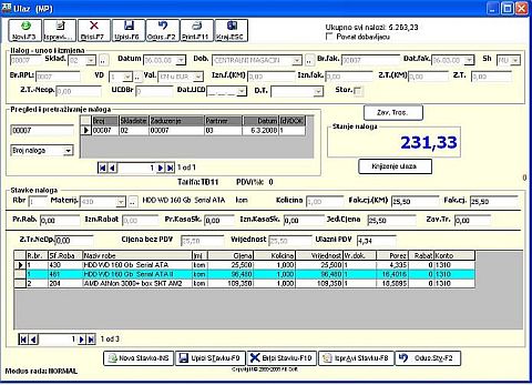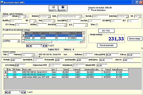 Kod unosa podataka za stavke nalga prvo se klikne mišem na "Nova stavka" ili tipkaINSERT, kursor se pozicionira na "šifru materijala" koju treba obavezno unijeti do 8 karaktera, a zatim "kolićina" pa zatim se unosi "Fakturna cijena" itd. Posto se unesu svi podaci automatski se zapamtite podaci klikom miša "UpisiStavke" ili ALT+A(F9) ili tipkom ENTER na stavku "Ulazni PDV". Ispravka se vrsi pozicioniranjem na zeljeni slog i klikom miša na "IspraviStavke" ili tipkama ALT+T (F8). Izlazak iz forme se vrsi klikom misa na "Kraj" , tipkama ALT+K ili tipkom ESC. Brisanje podataka (ozneceni slog) se vrši klikom miša na dugme "Briši" ili tipkama ALT+I (F10). U slucaju da neku operaciju smo zapoceli "Upis", "Ispravi" i sl i želimo da odustanemo tad klikonemo mišem na dugme "Odustani" ili tipkama ALT+O.