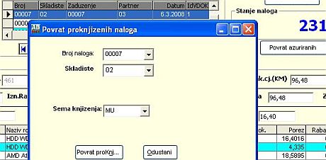 Komandno dugme "Povrat proknjizenog naloga" je namjenjeno da se željeni nalog povrati u neazurirane naloge. Klikom na dugme "Povrat proknjizenog naloga" pojavi se meni za povrat azuriranog naloga na kojem je odabran selektovani nalog sa forme Proknjizeni nalozi" ili sami odaberemo drugi nalog izborom sa padajuceg menija "Broj naloga", a zatim kliknemo na dugme "Povrat proknjizenog naloga " ili tipkama ALT+K.