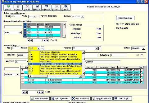 Kod unosa podataka za stavke nalga prvo se klikne mišem na "Nova stavka" ili tipkaINSERT, kursor se pozicionira na "šifru konta" koju treba obavezno unijeti do 8 karaktera, a zatim "Šifra partnera" ako stavka konta ima partnera ako ne, a zatim na "Datum" , "Broj dokumenta ", "Valuta dokumenta " , "Duguje" u slucaju da je konto 5430 i vrsta naloga faktura ide automatski na "Potražuje" kao i u slucaju konto 2120 vrste naloga virmana ,"Veza" i "Opis". Kod unosa podataka o za stavkama naloga obavezni su za unos "Broj stavke", "šifru konta" , "Datum", "Duguje" ili "Potražuje". Posto se unesu svi podaci automatski se zapamtite podaci klikom miša "UpisiStavke" ili tipkama ENTER na stavku"Opis". Ispravka se vrsi pozicioniranjem na zeljeni slog i klikom miša na "Ispravi Stavke"ili tipkama ALT+I (F8) . Izlazak iz forme se vrsi klikom misa na "Kraj" , tipkama ALT+K ili tipkom ESC. Brisanje podataka (ozneceni slog) se vrši klikom miša na dugme "Briši" ili tipkama ALT+B (F10). U slucaju da neku operaciju smo zapoceli "Upis", "Ispravi" i sl i želimo da odustanemo tad klikonemo mišem na dugme "Odustani" ili tipkama ALT+O.
