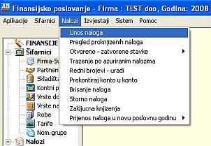 Do podmenija "NALOZI" dolazi se preko glavnog menija. Željeni unos podataka se poziva izborom istog sa padajuce liste podmenija "NALOZI".