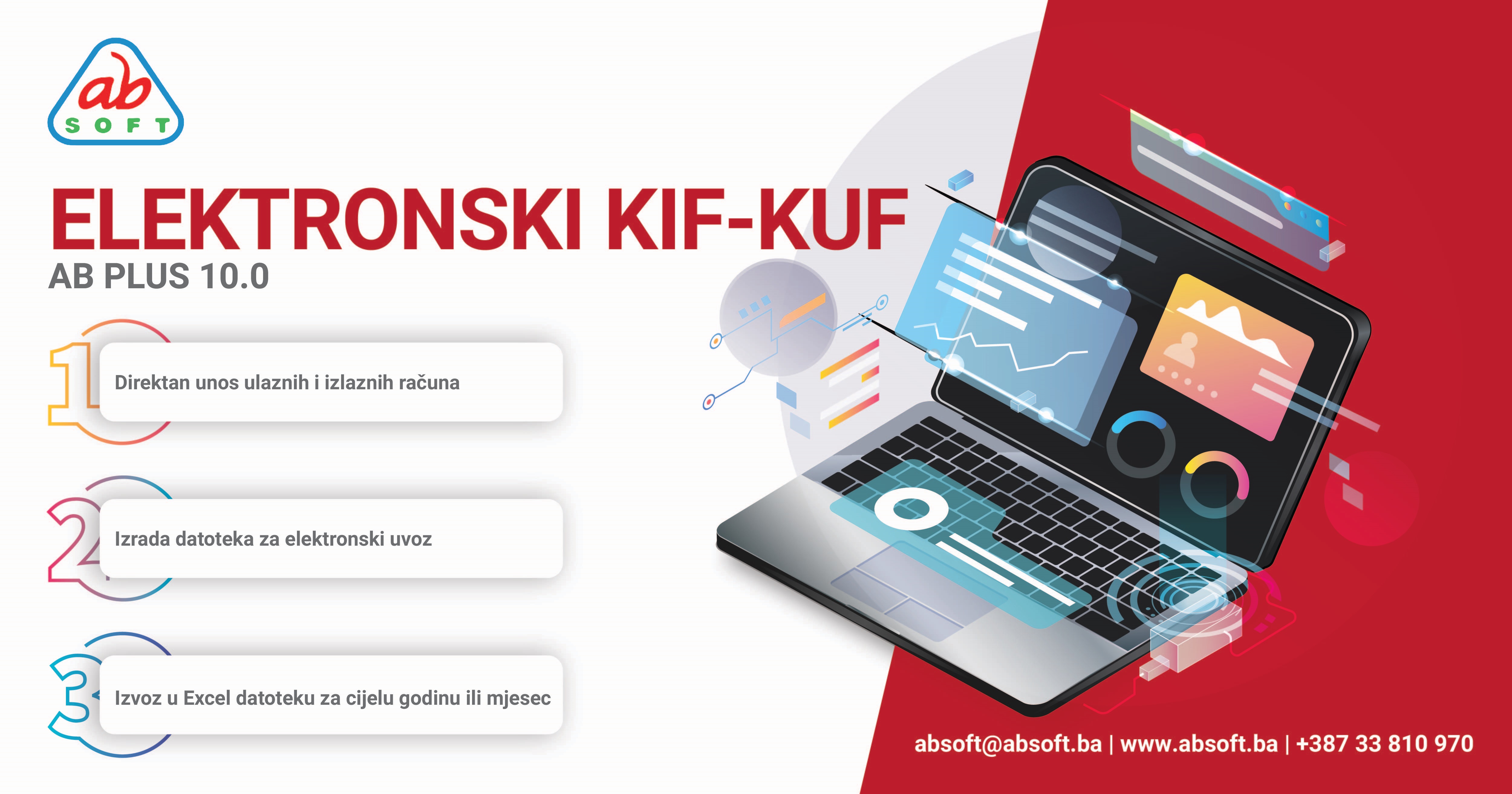 Elektronski KUF i KIF AB PLUS 10.0 (Moze samo kao modul ili u sklopu kompletnog programa) specijalizovani je program za vodenje KUF-a (Knjige ulaznih faktura) i KIF-a (Knjige izlaznih faktura) i elektronsku predaju UIO. Može raditi kao zaseban program ili biti korišten zajedno s Robnim-Materijalnim Knjigovodstvom i Finansijskim Knjigovodstvom za atomatsko knjiženje.
